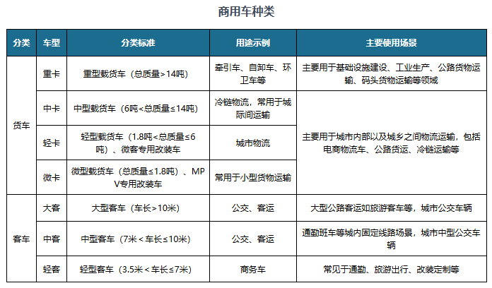 商用车作为生产资料,服务于公路客运和道路货运等场景,用于运送人员和货物。相较于乘用车,商用车运营属性更强,与公路客运量、货运量关系紧密,也与宏观经济的发展密切相关。商用车可划分为货车和客车两类。按照总质量等车型参数,货车可分为重卡、中卡、轻卡和微卡;按照车长等车型参数,客车可分为大客、中客和轻客等。