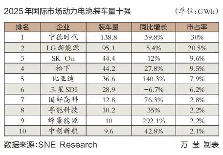 根据SNE Research的数据,2025年,除中国以外的国际市场动力电池装车量达到463GWh,同比增长26%。2025年,国际市场动力电池装车量十强同样有6家中国车企入围,而2024年为4家。其中,宁德时代稳居第一,比亚迪升至第五,国轩高科取代特斯拉成为榜单第七,蜂巢能源取代PPES跻身榜单第九;孚能科技、中创新航排名保持不变,分别位列榜单第八、第十。