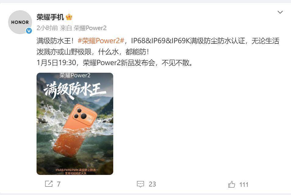 97国际-至尊品牌,源于信誉荣耀手机官方微博宣布,Power2已通过IP68/IP69/IP69K满级防尘防水认证,搭配10080mAh巨无霸电池,将于1月5日正式亮相。